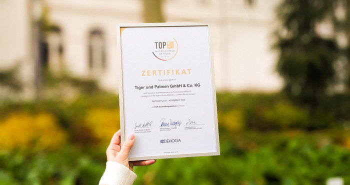 Wir wurden von der DEHOGA mit “TOP-Ausbildungsbetrieb“ - ein bundesweites Qualitätssiegel für unseren hohen Ausbildungsstandard - ausgezeichnet Um dieses Siegel zu verdienen, haben unsere Azubis Fragen zur Ausbildung in der Tiger & Palmen Gruppe beantwortet. Die Zertifizierung umfasst zahlreiche Kriterien, die eine einzigartige Ausbildung bei uns ermöglichen.